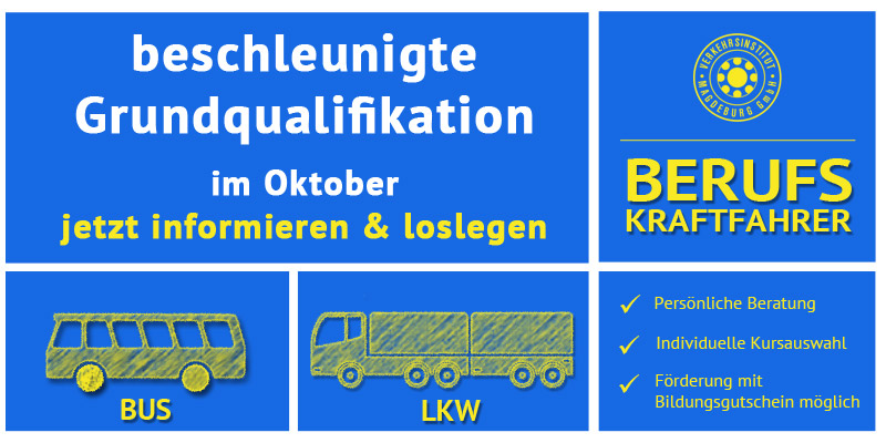 ab sofort sind die Termine für ADR Basiskurse und ADR Auffrischungskurse sowie für Sonnabendstermine für die Berufskraftfahrer-Qualifikation (Module) online. Buchungen sind ab sofort per E-Mail (mail@vi-md.de) möglich. Für weitere Fragen freuen wir uns auch über einen Anruf unter 0391857390.